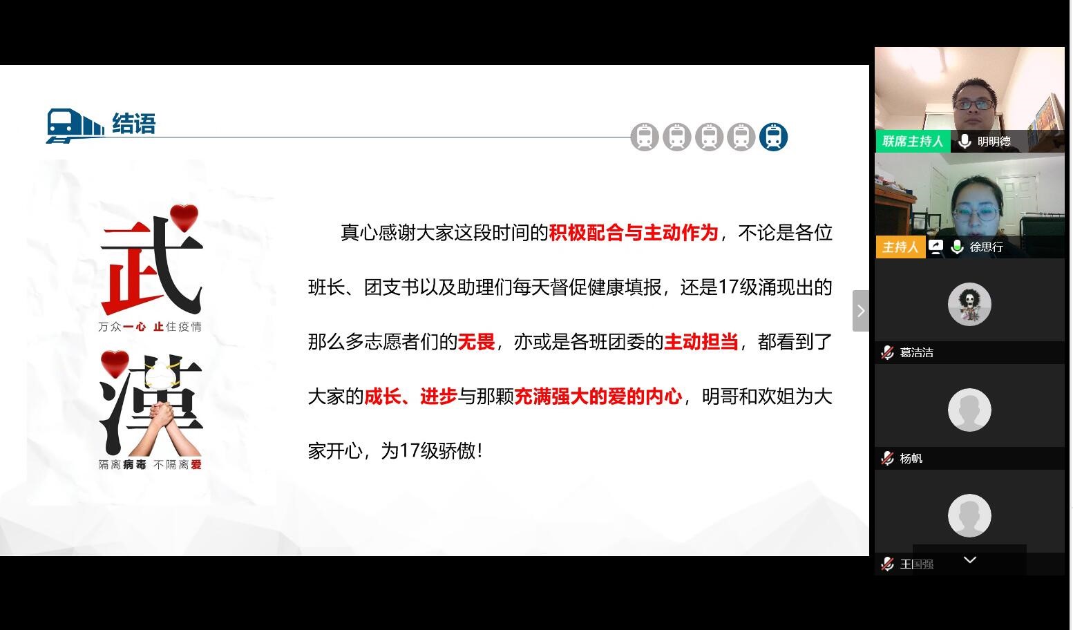 2017级线上班团例会顺利召开,辅导员黄德明老师、许欢老师与班长、团支书们第一次以这种特殊的方式“以情话疫”。