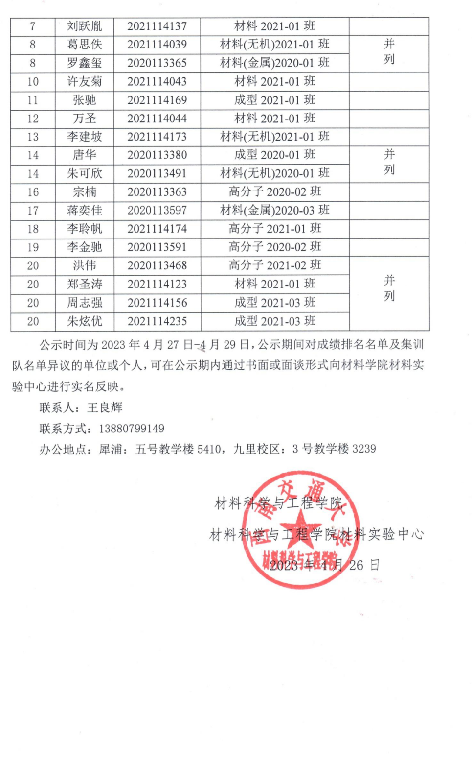 根据《全国大学生金相技能大赛组织办法》第三章第十五条之规定:“各参赛高校须从预赛前 20 名选手中选择出不少于 10 名选手组成代表队,填写复赛参赛信息表 (统一格式),于所在赛区复赛开始前提交给大赛秘书处。”我校预赛前20名(第二十名有4名选手并列)共23名选手组成全国大学生金相技能大赛和四川省大学生金相技能大赛的集训队。所以西南交通大学参加第五届四川省大学生金相技能大赛暨第十二届全国大学生金相技能大赛复赛的集训名单公示如下: