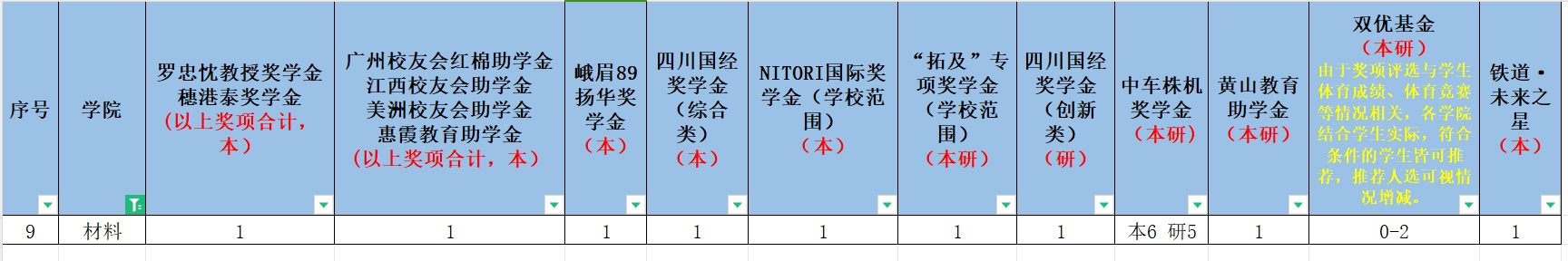 学院学校范围专项奖助学金可推荐名额分配表如下图所示;学校范围专项奖助学金评选办法见学校通知附件3。