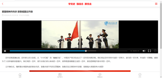 首先,大家观看了升旗云视频。见国旗,如见中国,激昂有力的国歌,庄严肃穆的仪式,极大鼓舞了大家铭记历史,牢记中国共产党成立以来为人民服务的伟大事迹,提升民族自豪感和归属感。
