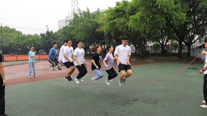 团体赛分为初赛和决赛,总共有六支队伍参加。初赛为计次60s男女混合集体跳,由成绩排名前四的队伍进入决赛。团体决赛为集体跳绳100下的计时赛,赛制的设定也是为了呼应建党100周年,比赛中大家齐心协力,共同努力,最终硕士3班以2分06秒的成绩取得了第一名,硕士1班和5班的混合队获得了第二名,第三名则是硕士4班的队伍。