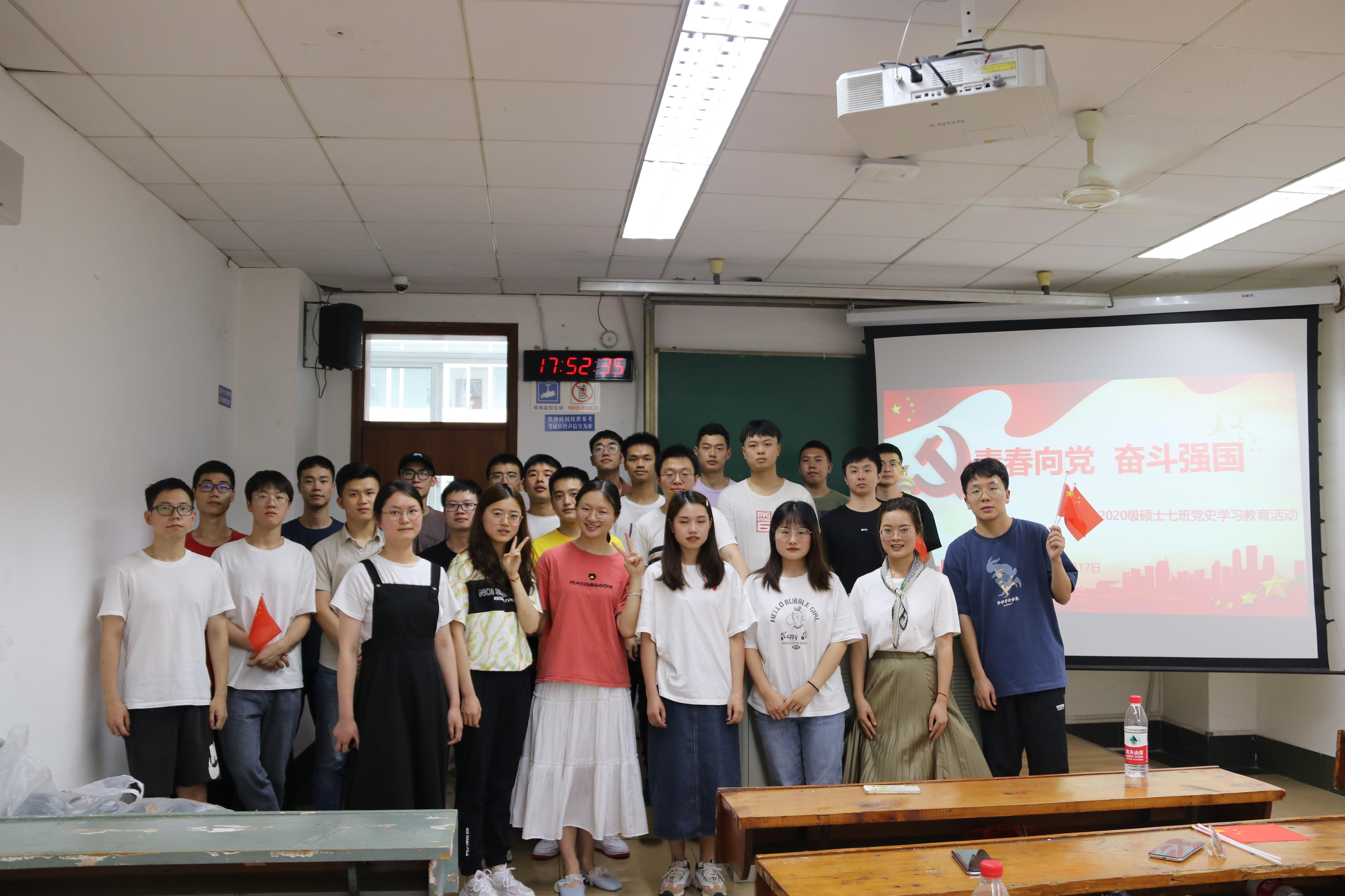2020级硕士7班,在九里校区4403B举办了“青春向党·奋斗强国”党史学习教育主题活动。本次活动由班长黄成、团支书李俊杰牵头策划,全体班委参与组织,全班同学积极参与。活动由李俊杰同学主持,2020级研究生辅导员王誉静老师参与本次活动。