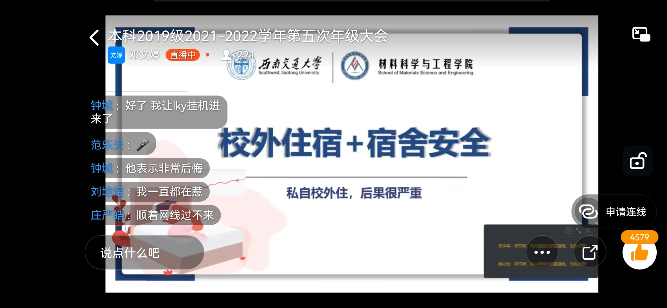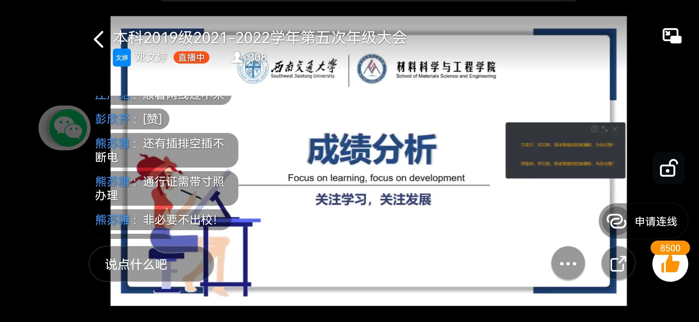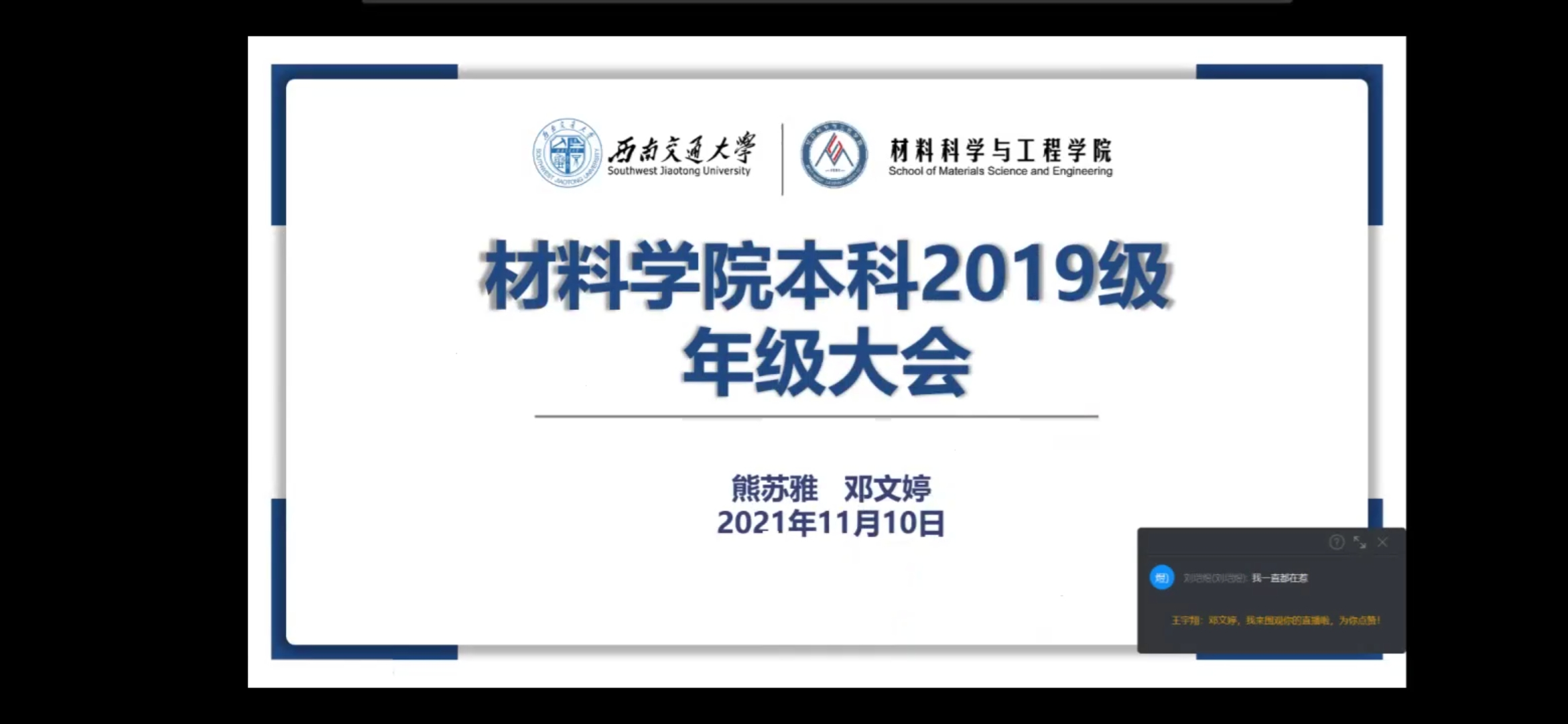 本科2019级2021-2022学年第五次年级大会聚焦“安全”和“成绩”两个关键词,于2021年11月10日晚21:30在钉钉平台顺利召开。2019级本科全体同学参与大会,2019级辅导员邓文婷、熊苏雅出席并主持。