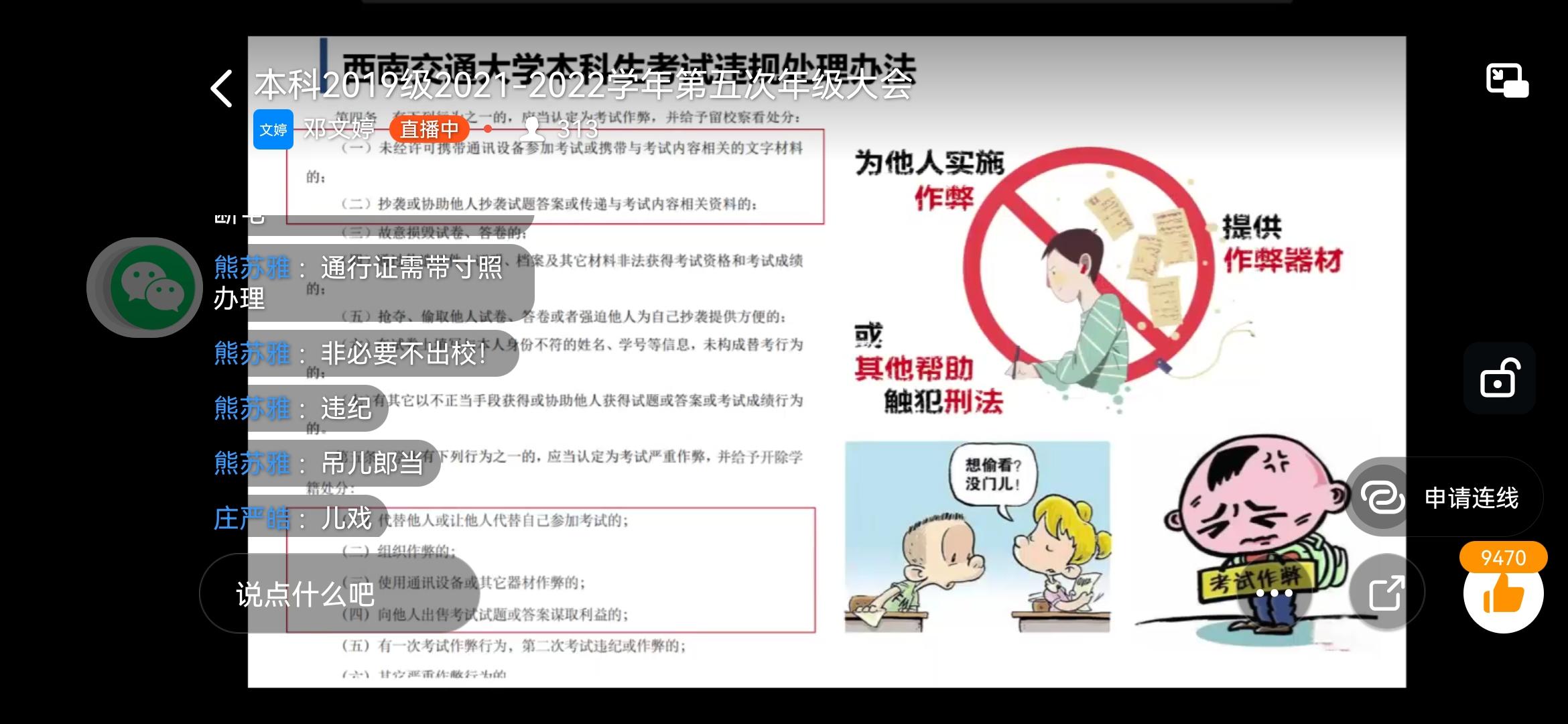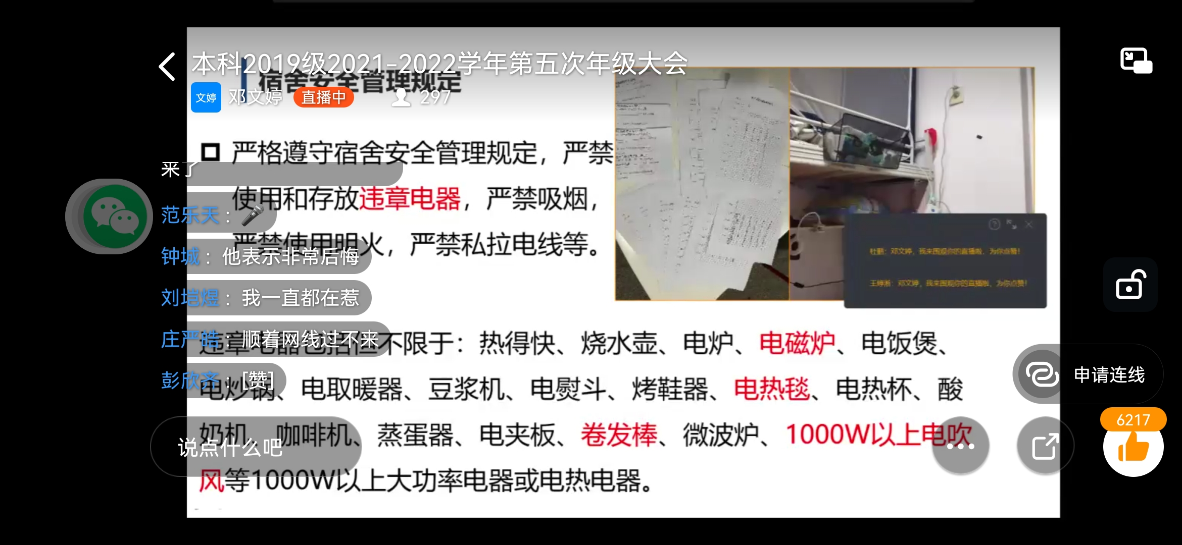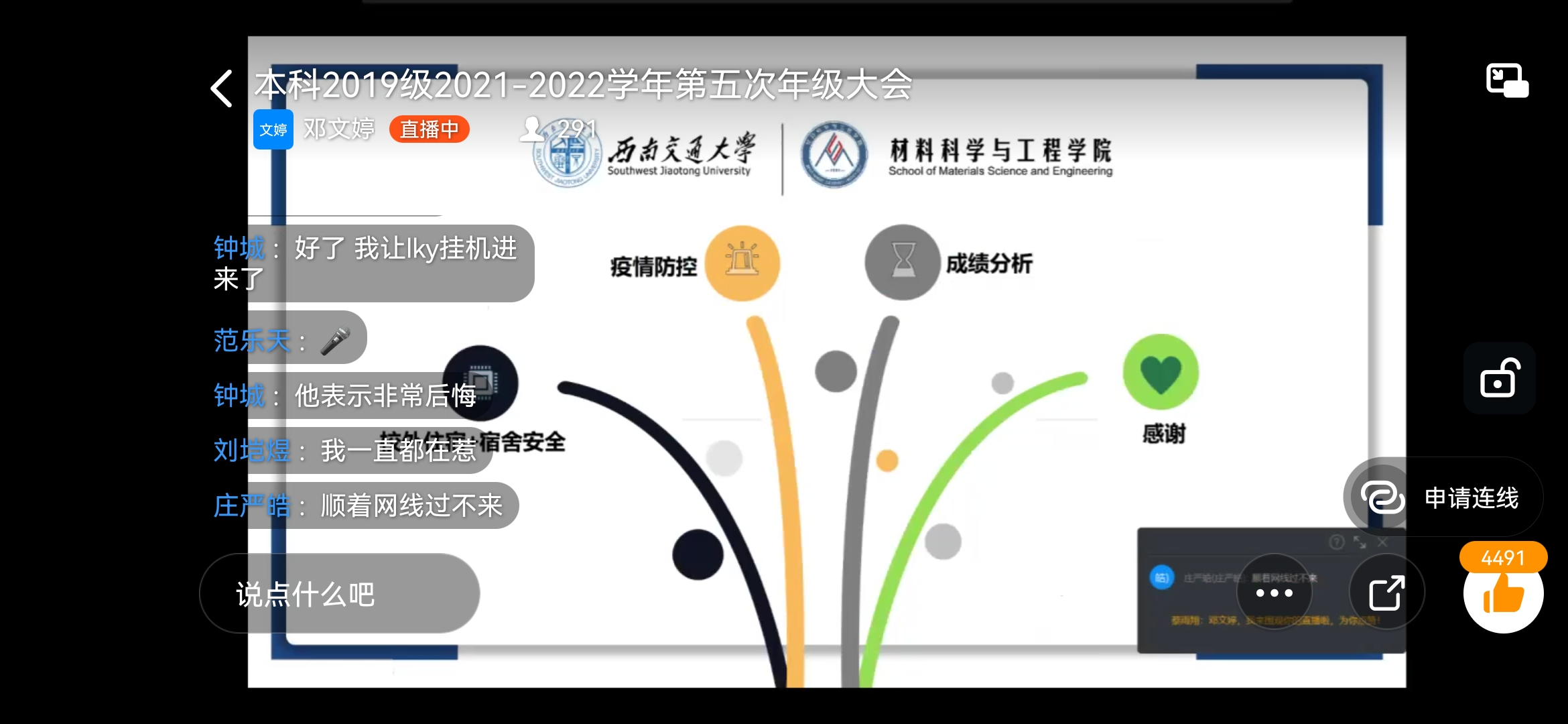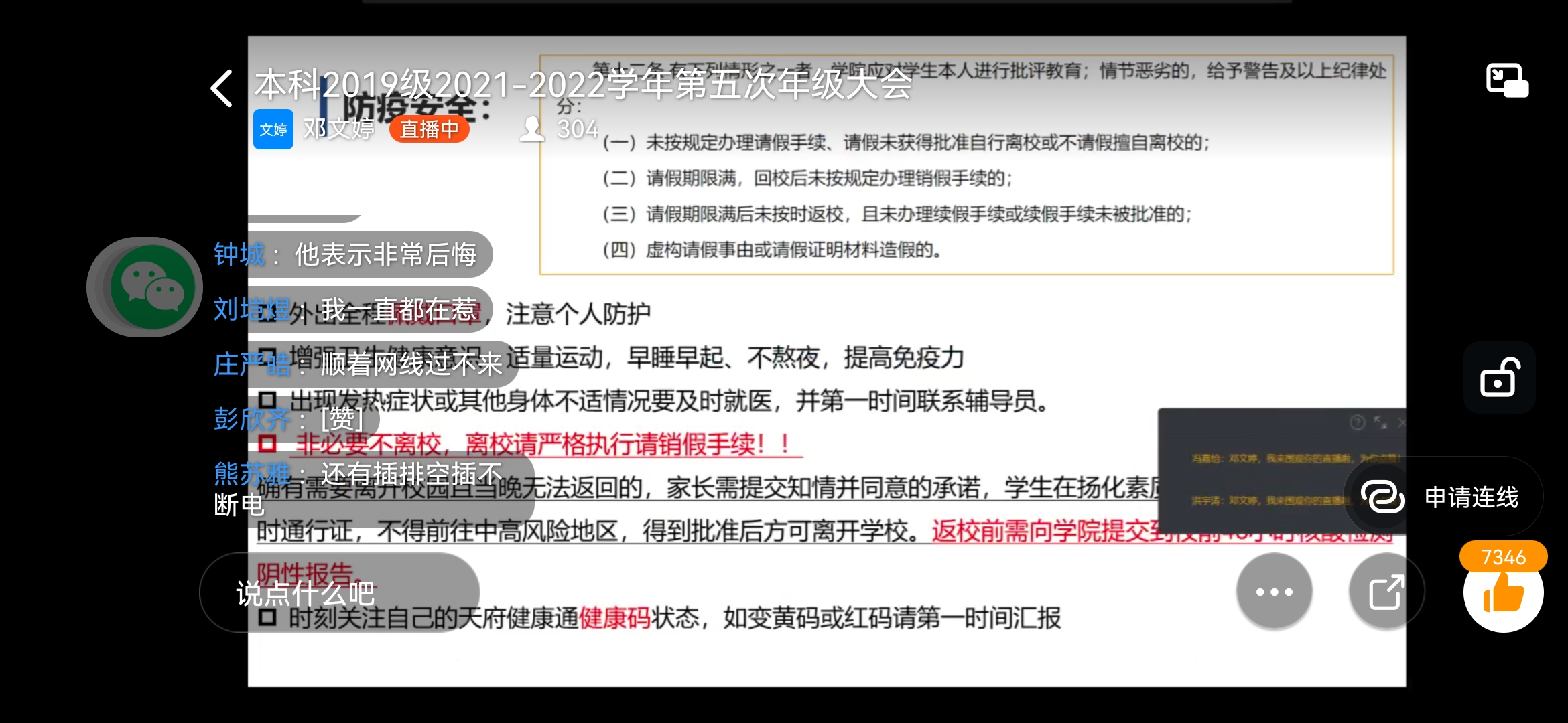 本科2019级2021-2022学年第五次年级大会聚焦“安全”和“成绩”两个关键词,于2021年11月10日晚21:30在钉钉平台顺利召开。2019级本科全体同学参与大会,2019级辅导员邓文婷、熊苏雅出席并主持。
