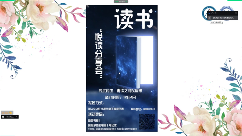 研究生会和西南交通大学研究生心理协会在线上联合举办了以“书犹药也,善读可以医愚”为主题的悦读分享会活动。