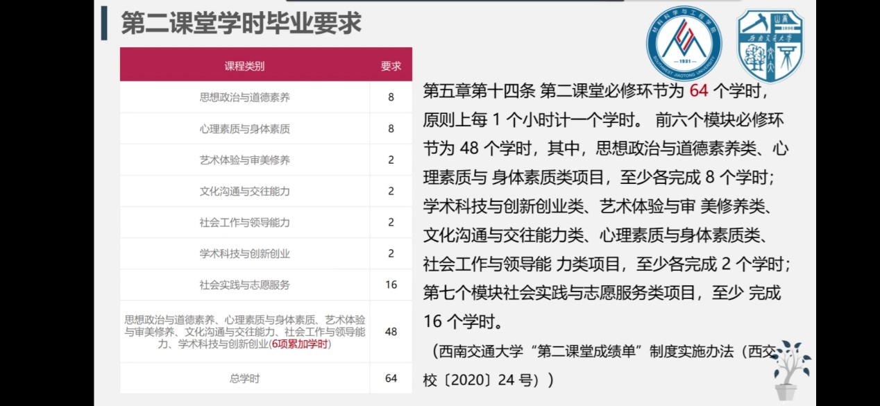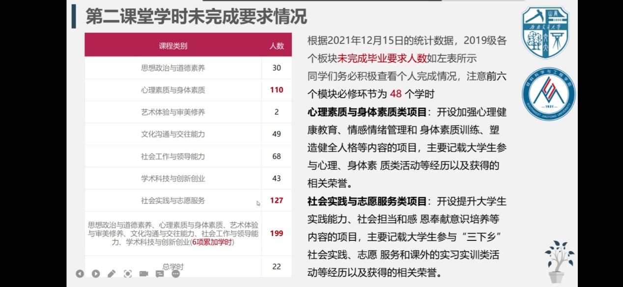 接下来,杜鹏提醒同学们要留意自己的第二课堂学识。根据统计结果显示,心理素质与身体素质和社会实践与志愿服务学识两个板块未达到毕业要求的人数较多,提醒未完成其他要求的同学多关注第二课堂。
