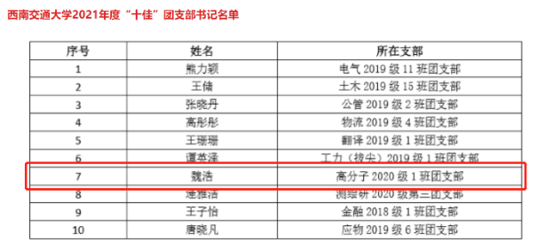 近日,西南交通大学2021年度“十佳”团支部书记评选结果正式揭晓,全校共计10名团支部书记获此殊荣,大发在线体育投注平台