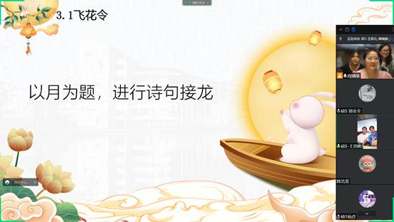 在第三个游戏环节,李涛副院长吟诵第一句诗词为此次结合中秋佳节主题的飞花令拉开了帷幕。“今夜月明人尽望,不知秋思落谁家”“一月可曾闲几日,百年难得闰中秋”······同学们通过飞花令欣赏了中秋诗词,即使远离家乡,但也有同学和老师在身边作伴,感受到了人情温暖。最后,以两班激烈有趣的脑筋急转弯游戏结束。