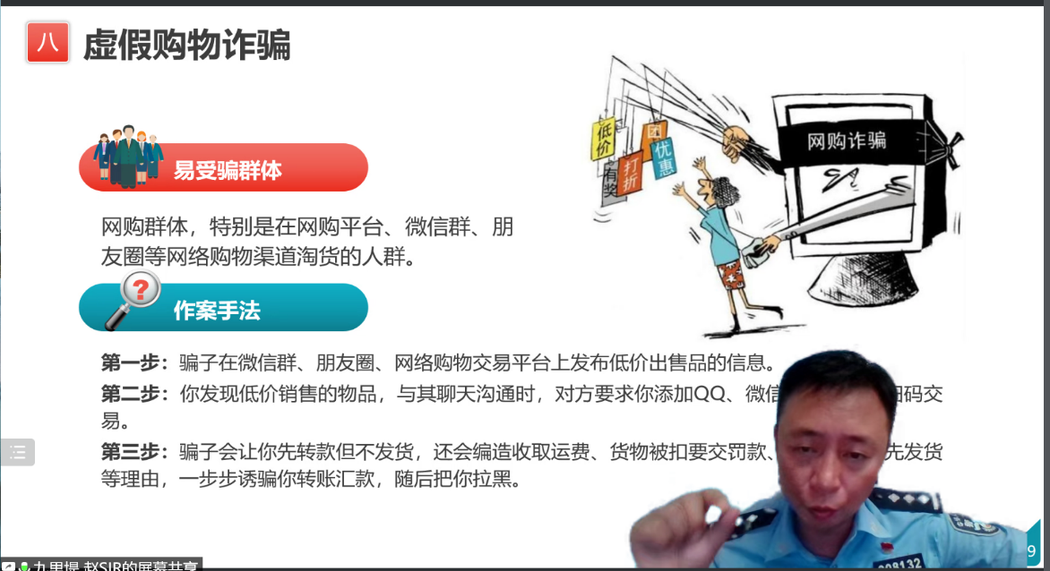 会议伊始,赵警官开门见山指出当前社会上电信网络诈骗案件频发,反诈工作开展形势严峻,犯罪分子的手段花样百出,让人防不胜防。九里堤这几年电信网络诈骗案涉案金额就高达两百多万,即使是高校老师也未必能完全避开网络诈骗陷阱,提醒各位师生一定要加强防范意识。