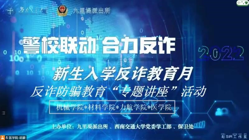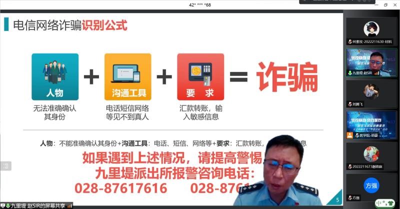 联合机械学院、力航学院和医学院邀请九里堤派出所赵磊警官为全体研究生新生开展了“警校联动,合力反诈”防范电信网络诈骗专题教育。