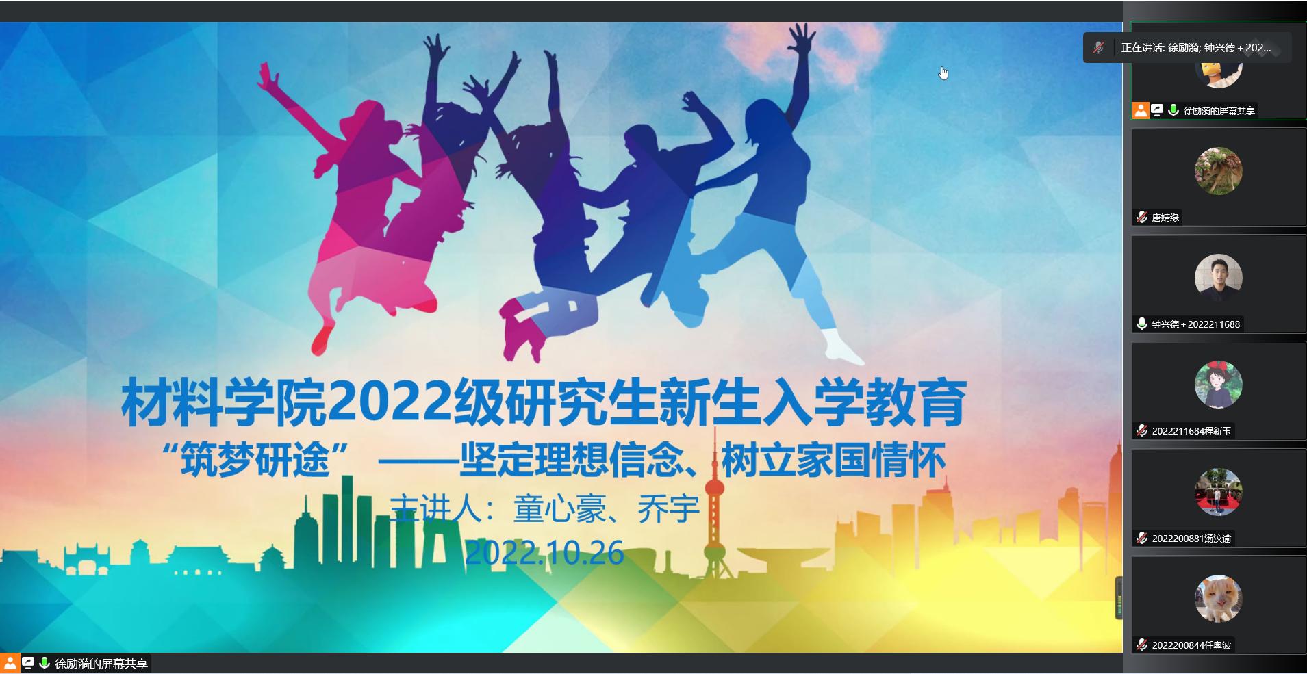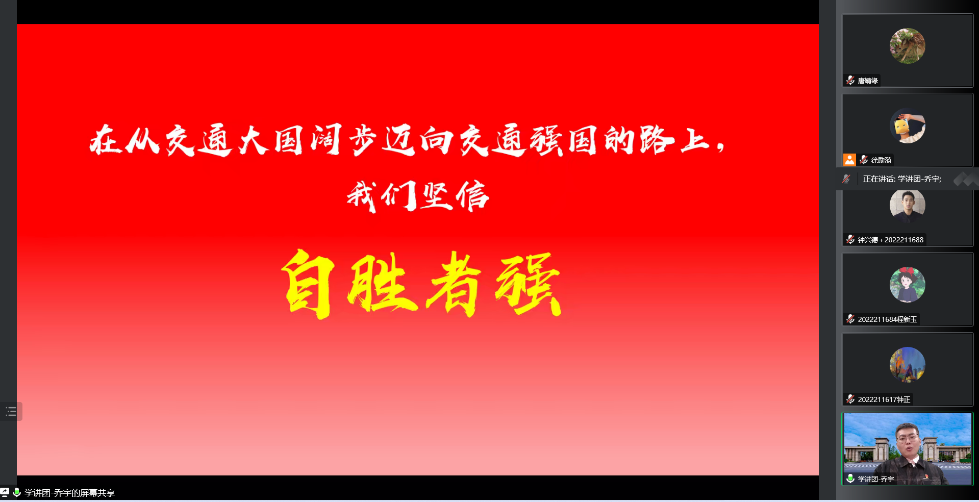 于2022年10月26日晚19:00线上举办“筑梦研途——坚定理想信念、树立家国情怀”专题讲座。本次讲座邀请西南交通大学“红路”理论学讲团成员、土木工程学院博士童心豪和交通运输与物流学院硕士乔宇担任主讲。2022级全体研究生新生参与本次讲座,由辅导员徐励漪主持。