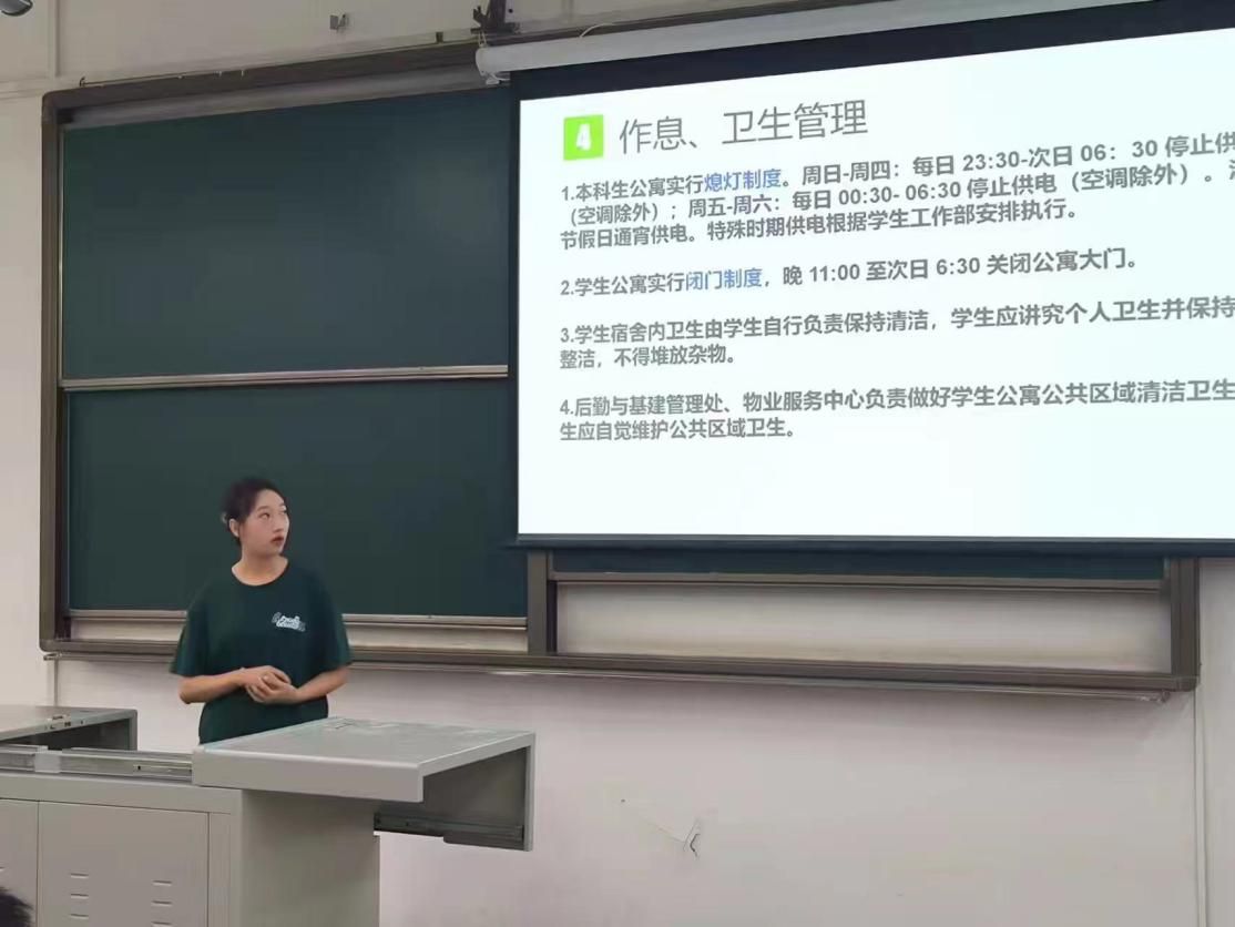 为规范学生管理,保障学生合法权益,将管理与育人相结合,培育优良校风学风,培养德智体美劳全面发展的社会主义建设者和接班人。同时为进一步强化新生安全意识,树牢底线思维、坚实筑牢学生校园安全防线,熟悉学校宿舍等相关管理制度。2023年9月21日下午,大发在线体育投注平台