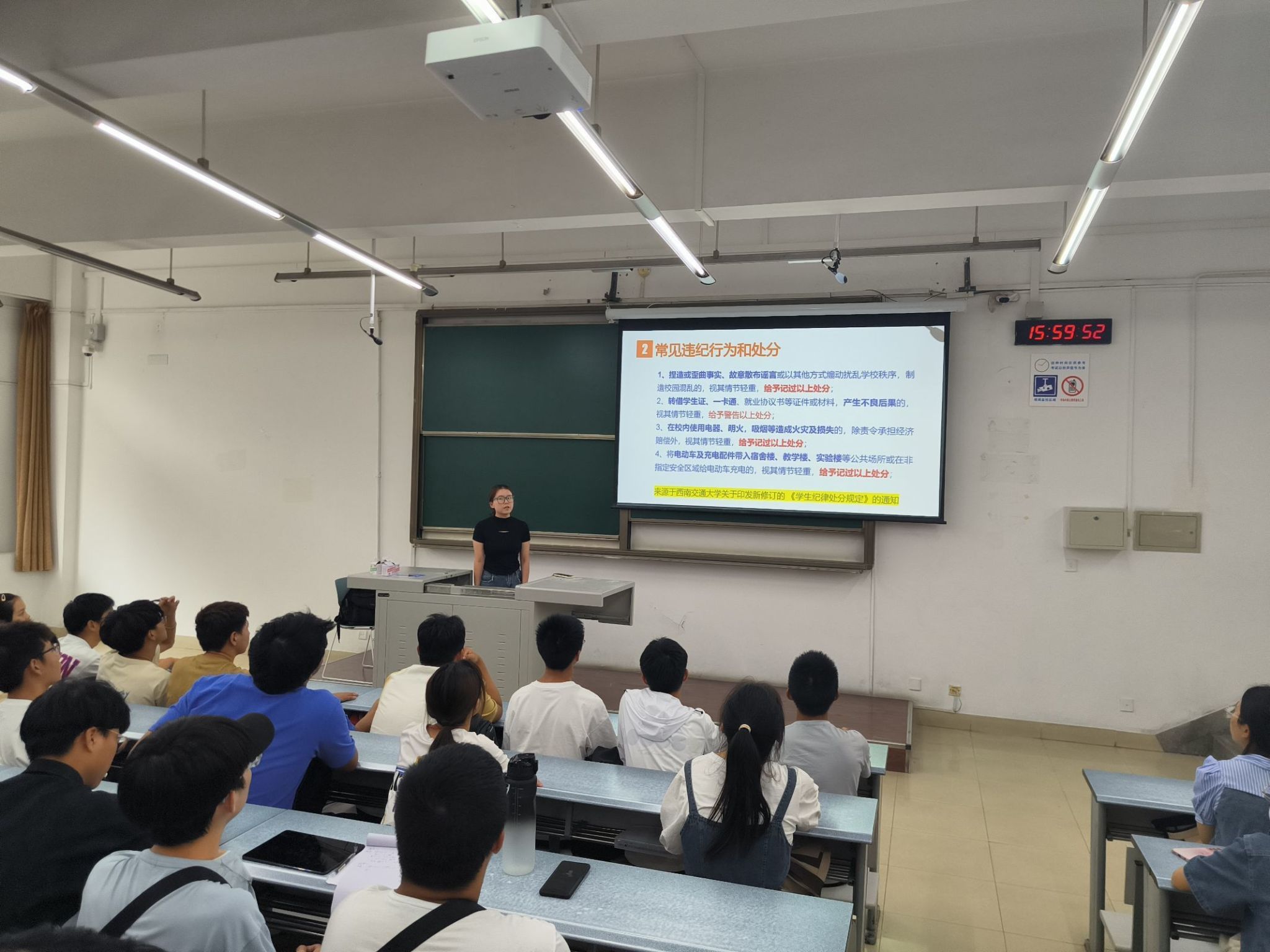 本科2023级辅导员、学院青年讲师团成员熊心怡及学院青年讲师团成员、本科2023级年级助理向思林面向2023级新生开展年级大会暨新生入学安全教育。