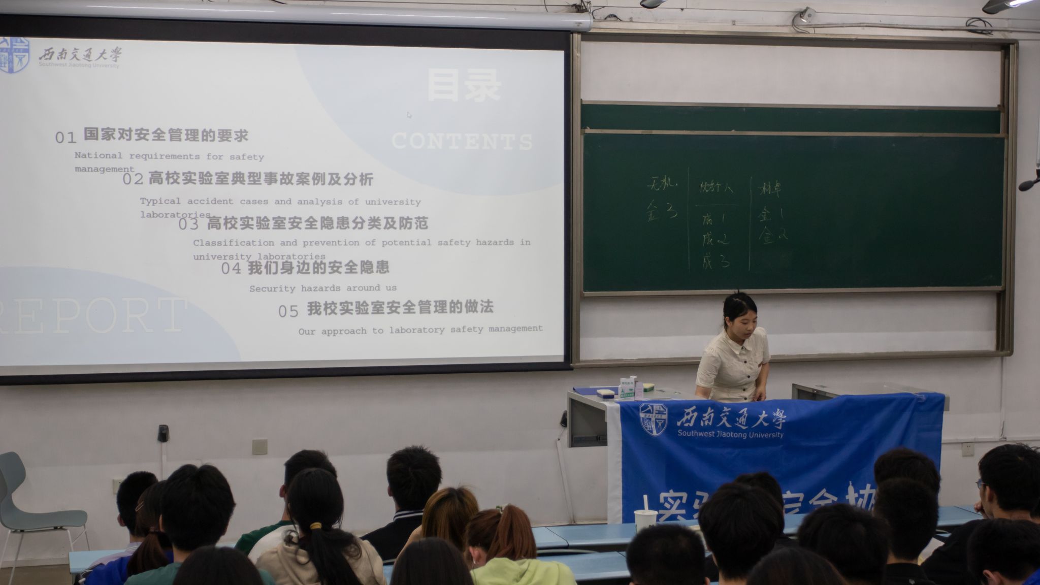 本科2022级学生进一步树立安全意识、掌握安全技能,校实验室安全大使团宣讲部部长孙哲萱,带领同学们一起学习实验室安全相关知识,通过对安全生产-高校实验室典型事故案例及分析,危化品、火灾防范等知识讲解,将理论与实际结合,举例实验室常见的安全事故,向同学们说明了实验室安全的重要性,为同学们接下来的实验课以及科创训练打下基础。