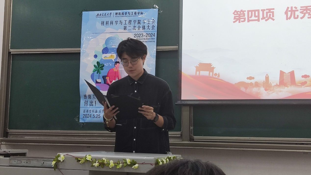 大会第四项议程,优秀部员发言。刘砚晨同学讲述了自己一年工作的经历,分享了个人心得体会,对未来作出美好憧憬,赢得了同学们的热烈掌声。