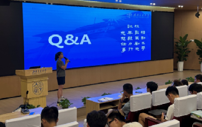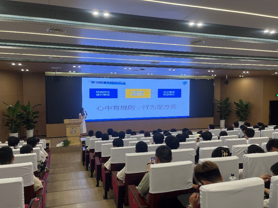 紧接着,罗馨梦老师为2024级新生们进行教学管理规章制度解读,其中包括学籍管理、成绩、选课、学士学位外语水平、创新创业实践学分、课程考核要求、考试违规等一系列教学相关规定,帮助同学们全面了解了学校教育教学相关制度,更强调了严守我校的严谨治学,严格要求的“双严”传统,她说道“心中有规则,行为定方圆”,要求同学们认真学习本科生管理制度,做一名遵纪守则的合格大学生。