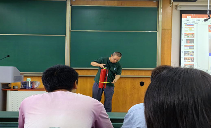 水火无情,珍爱生命。会议伊始,老师给同学们进行了消防安全知识培训,讲述了消防安全工作的重要性,强调了此次活动开展的目的和意义。老师从近期学校火灾事故案例入手,引起了同学们的共鸣。通过展示真实事故场景和相关数据,深入阐述了火灾发生的原因、蔓延的特点以及及时实施防火措施的重要性。同时他介绍了干粉灭火器、逃生面罩、烟感器、消火栓、疏散平面图及应急灯等在生活中的常见位置及重要性,并现场演示了干粉灭火器、逃生面罩的正确使用方法,指导同学们规范使用消防器具,提升消防安全知识和技能。