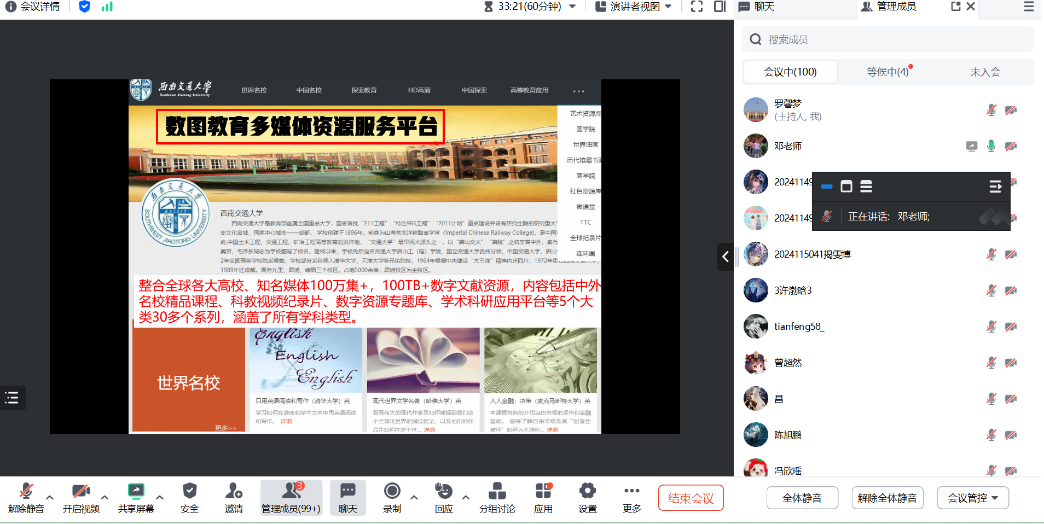 线上培训过程中,邓老师以通俗易懂的语言详尽地介绍了涉及图书馆学习的各个方面,包括图书馆的承包活动、外部布局、馆藏资源、服务方式以及文明阅读等诸多新生存疑较多和往年出现问题较多的方面,着重强调了图书馆数字资源的正确利用和书籍检索的相关方法。旨在使同学们充分了解并掌握图书馆的功能与资源并逐步学会利用图书馆资源,培养学生检索能力及相关学科专业素养,以便同学们更好地利用图书馆资源进行学习和研究。