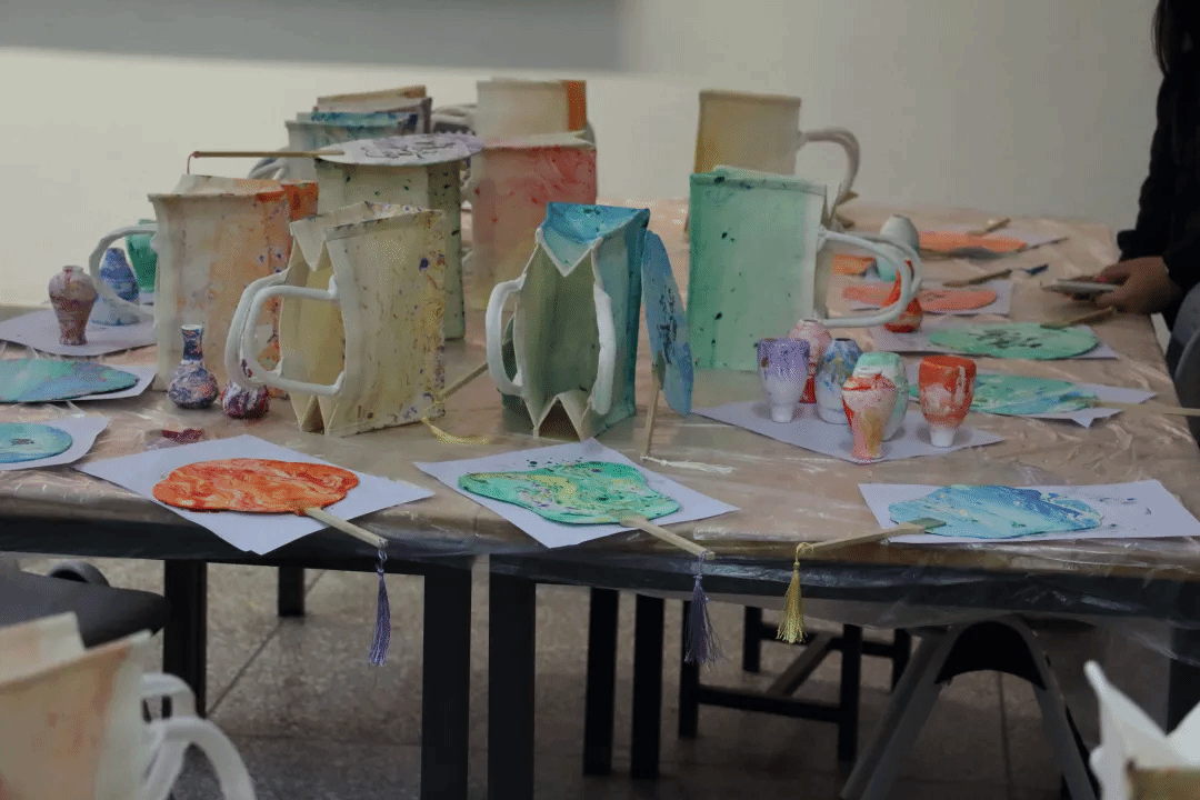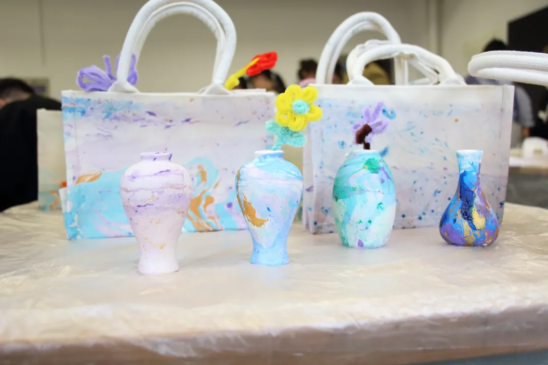 活动开始前,志愿者们分工明确,井井有条地进行现场布置。活动开始,现场人头攒动,参与者井然有序地排成队伍,领取空白扇。在志愿者的介绍下,大家了解了漆扇的历史背景、文化内涵及价值意义,通过现场展示的漆扇制作技艺,近距离感受到了传统工艺的独特魅力。随后,在志愿者的指导下,参与者们纷纷开启了他们的漆扇制作之旅,大家精心挑选好自己喜欢的颜色,在志愿者的帮助下,小心翼翼地将彩漆放入颜料桶中,并用小棍子轻轻搅动。通过不同的旋转角度和摆动方式制作属于自己的,独一无二图案,很快一把把绚丽多彩的漆扇就呈现在眼前,大家纷纷展示着自己的作品,脸上洋溢着喜悦的笑容。除了漆扇制作现场还有扭扭棒制作,素胚瓷瓶的描画等供大家选择。