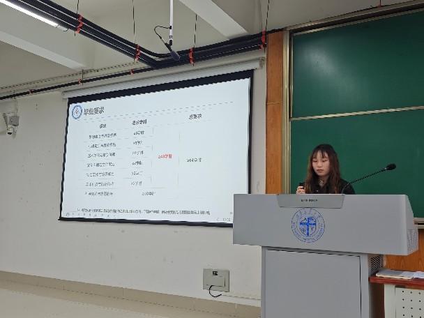 第三部分,熊心怡老师为同学们梳理了2023级本科生2023-2024学年的成绩,对优秀率、四六级通过率、欠学分情况等重点数据进行了解读,便于同学们对各科目的学习状况有了更加清晰的认识。熊心怡老师特别强调了学习态度和方法的重要性,鼓励同学们要树立正确的学习观念,注重学习方法的培养,努力提升自己的学习能力和水平,引导同学们对未来进行职业生涯规划,认真对待大学每一天的学生生活。临近学期末,熊心怡老师希望同学们尽快进入备考阶段,认真复习,提醒同学们诚信考试。