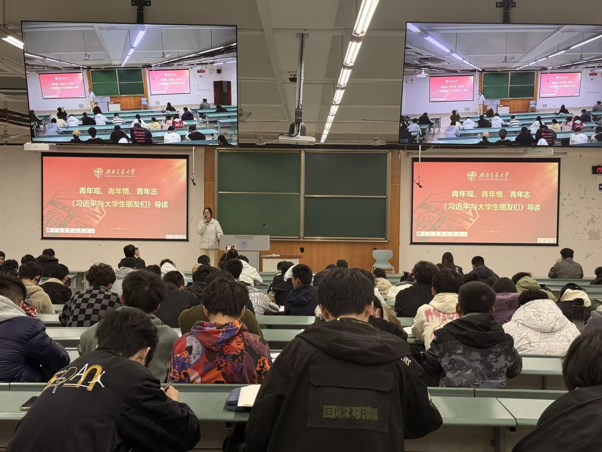 第二部分,由张琬褀老师以“青年观,青年情,青年志”为主题,领学《习近平与大学生朋友们》。张琬祺向同学们介绍了该书的内容概况,并向同学们介绍其中饱含着习近平总书记薪火相传的“青年观”、念兹在兹的“青年情”、厚望重托的“青年志”,为做好新时代新征程党的青年工作提供了重要遵循。提醒同学们牢记党和人民的殷切期待,争做有理想、敢担当、能吃苦、肯奋斗的新时代好青年,成为让党放心、爱国奉献、担当民族复兴重任的时代新人。