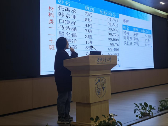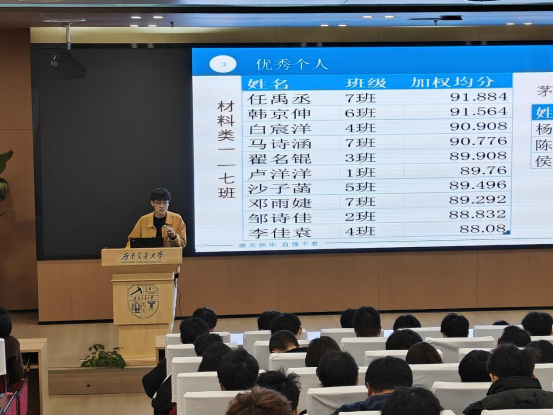 会议伊始,年级辅导员许欢老师和李瑞英老师向同学们做了自我介绍。接着,李瑞英老师对2024-2025学年秋季学期的智育成绩进行了全面总结。李老师用数据分析了各班均分和各班优秀人数,特别表扬了绩点排名前10的优秀学生,并邀请材料3班的翟名锟同学分享学习经验。翟名锟提到:“合理规划时间、主动与任课老师沟通是提高效率的关键。”同时,许欢老师也指出部分学生存在偏科和挂科现象,提醒大家重视基础课程,积极参与课后答疑和学科互助小组。