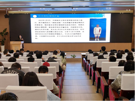 会议最后,许欢老师以“安全无小事”为主题开展宿舍安全教育。通过展示近期高校宿舍安全事故案例,许欢老师重点强调了违规电器使用、私拉电线、卫生隐患等问题,同时关注同学们的心理健康,提醒同学们防范电信网络诈骗。