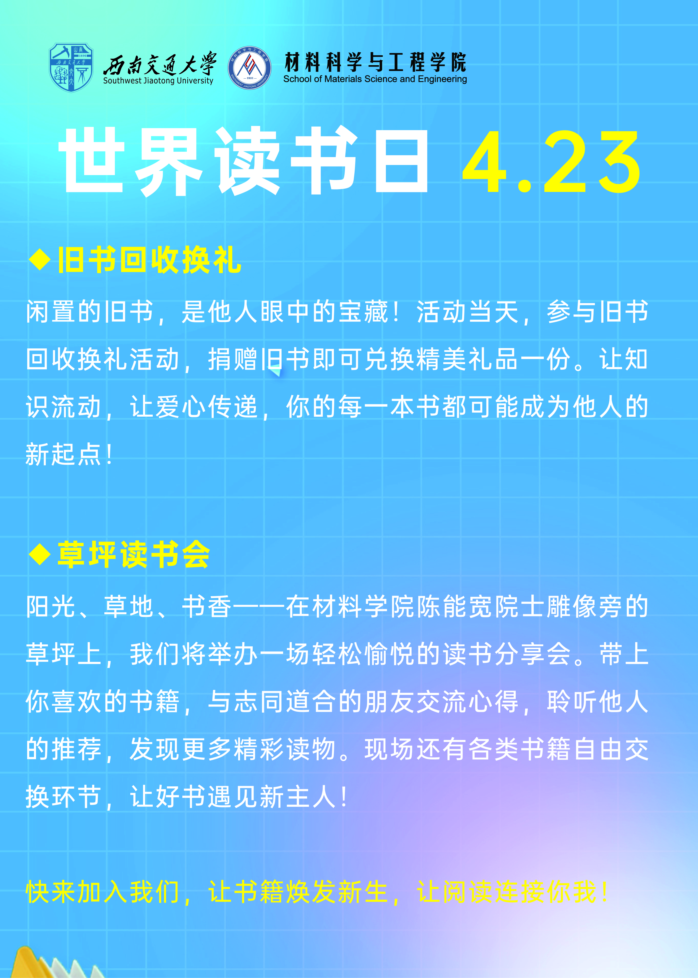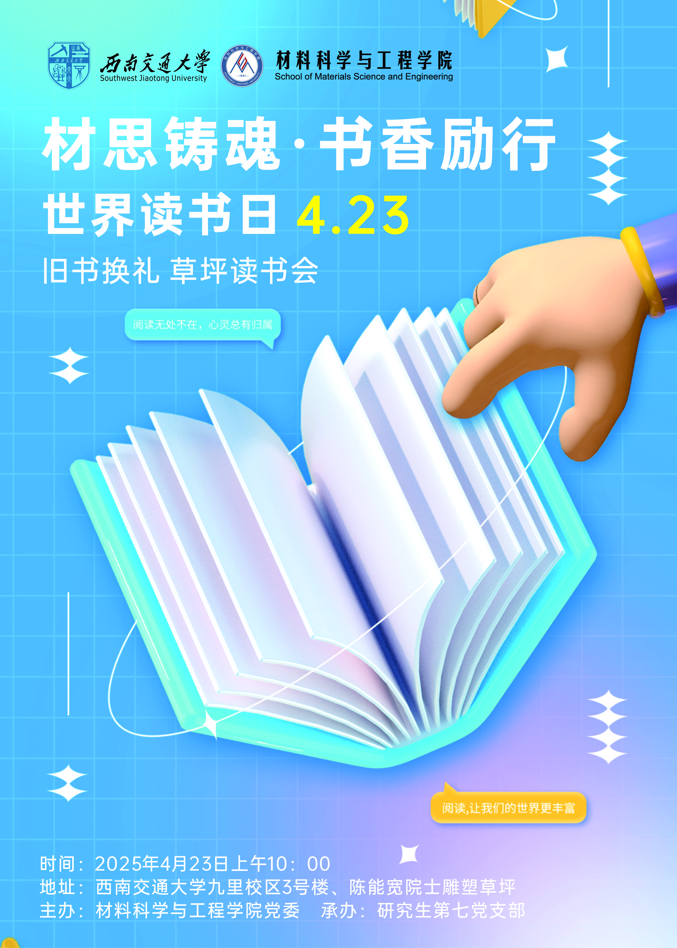 研究生第七党支部延续公益精神,举办“材思铸魂,书香励行”第二届世界读书日主题活动!4月23日(周三)将迎来第30个世界读书日,邀您加入旧书换礼行列,闲置旧书可带到现场兑换礼品,同时可参与上午10点草坪读书会,活动现场准备茶歇与课外书籍供您使用,还有表演哦!
