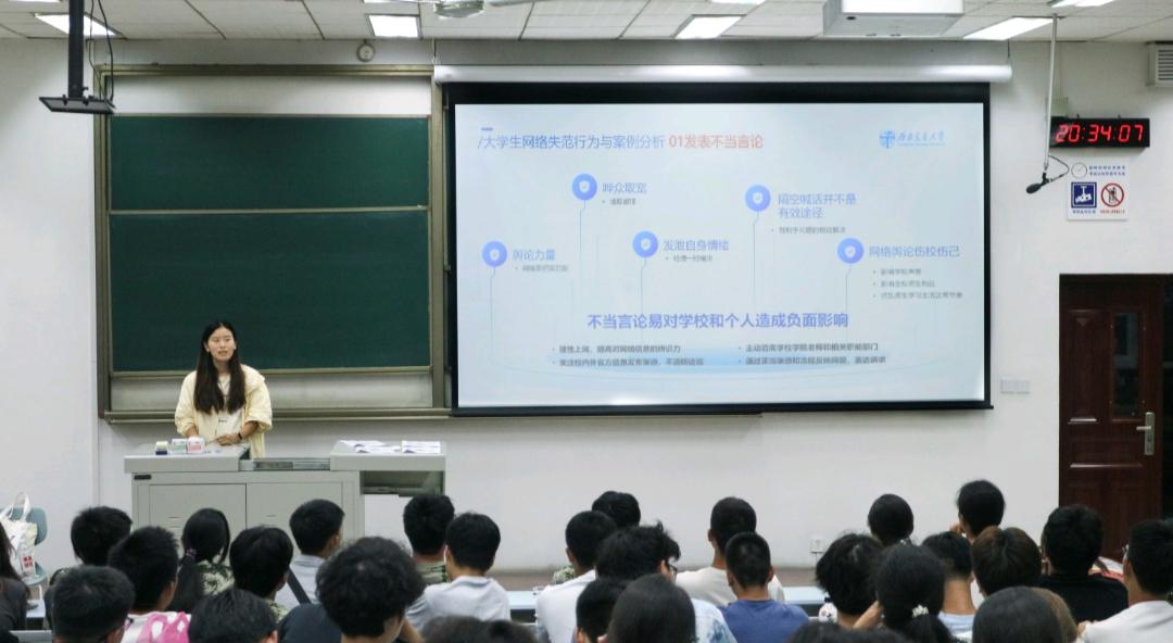 于X1315教室面向2025级本科新生集中开展入学安全教育及网络素养教育专题活动,为新生成长成才筑牢“安全第一关”。活动由辅导员张若男、马娟主持,特邀电气工程学院辅导员罗霁轩为同学们讲解新生安全教育。