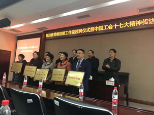 戴虹教授工作团队荣获“四川省技能人才创新工作室”的荣誉称号,并于2018年11月28日下午2点30分在四川省中国工会第十七次全国代表大会精神传达会上获得授牌。