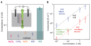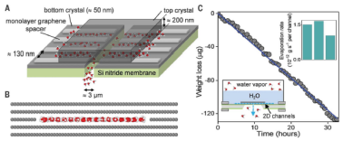 此前的工作(Science,2017, 358, 511-513)曾报道了两个原子层厚度的类似通道,通道高度约为6.7埃;在这种通道中水合离子可以通过挤压或脱掉水合层的方式进入通道进行传输。而此次最新建立的单原子层高度通道则能够完全阻隔任何水合离子的传输,从而加深我们对原子级别空间内分子传输过程的理解,甚至有助于推进仿生方向的发展,而这也是这篇文章的重大进展所在。