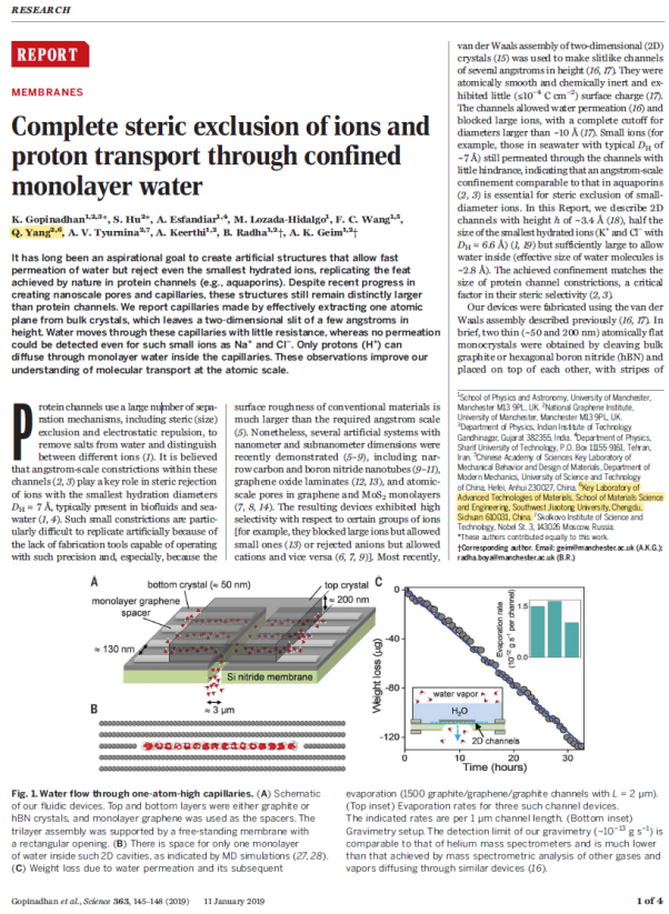 2019年1月11日,国际顶级学术期刊Science在线发表了西南交通大学与曼彻斯特大学合作研究成果,”Complete steric exclusion of ions and proton transport through confined monolayer water”(狭窄单层水通道中质子传输与全尺寸离子位阻效应)。该成果由诺贝尔物理学奖获得者、西南交通大学荣誉教授、曼彻斯特大学教授Sir Andre Geim引领,大发在线体育投注平台