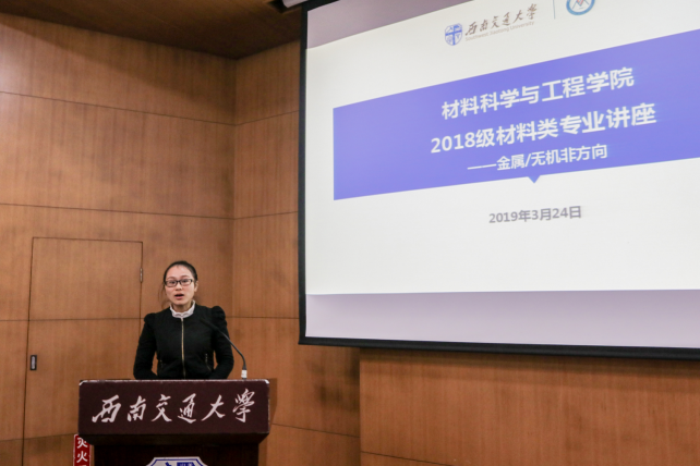 分专业讲座(金属/无机非金属专业方向)在图书馆一号报告厅举行,讲座的目的在于让同学们更系统地了解金属/无机非金属这一专业的情况,并且给同学们做出就业指导。出席本次讲座的领导有:院长朱旻昊,副院长冷永祥,教授胥永刚、权高峰,副教授黄银、蒋小松,曾迎老师,张松老师,钟政烨老师,高级工程师崔国栋,优秀校友成都市道德模范郭双全,学工组副组长、团委书记黄德明,2018级辅导员黄静瑶及罗丹。