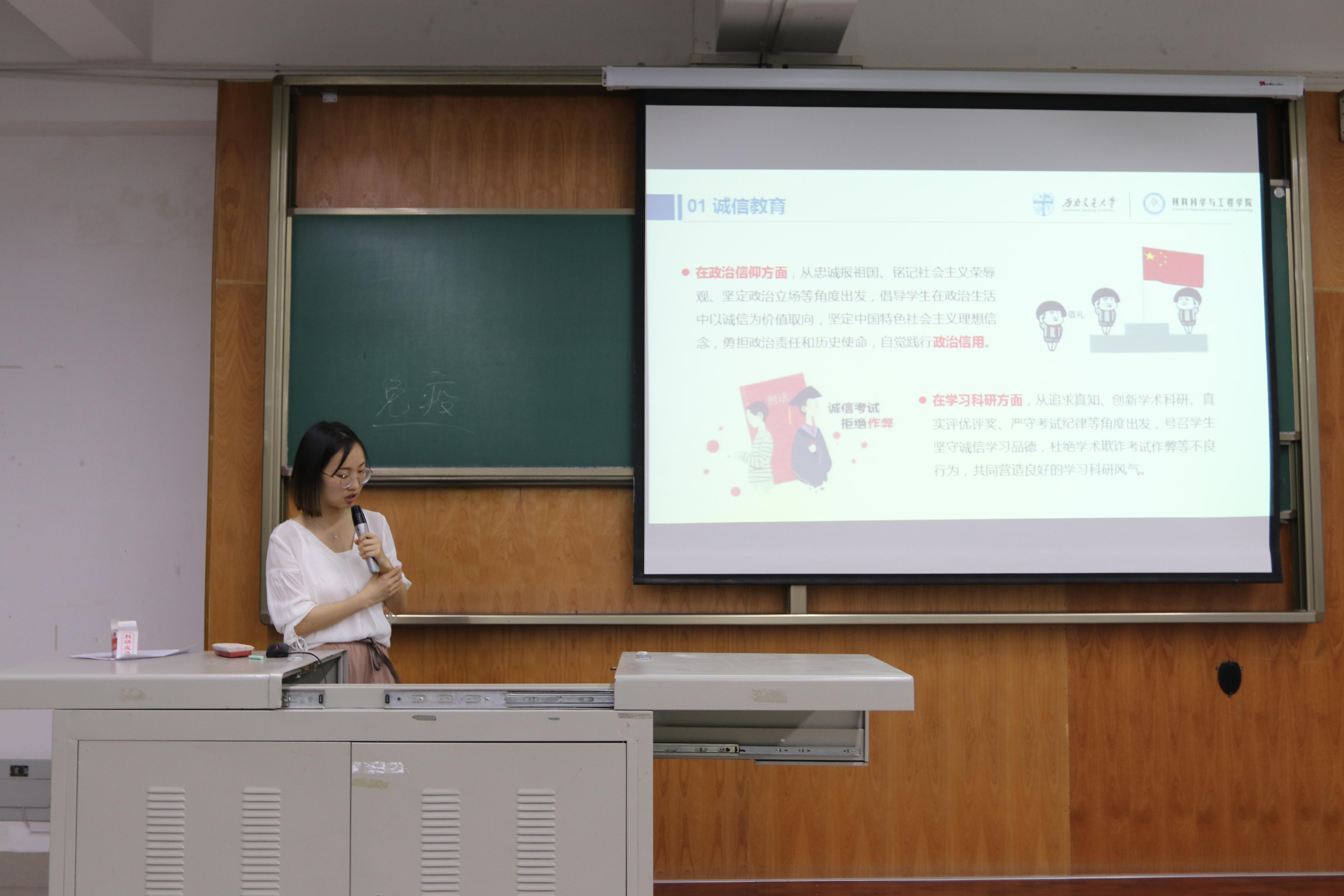 第三项,诚信教育。王莹老师从政治信仰、学习科研、就业创业、人际交往以及经济生活等多方面向在座学生阐述了诚信的重要性,并且倡导同学们在学习生活中以诚信为价值取向,坚定中国特色社会主义理想信念,勇担历史使命。
