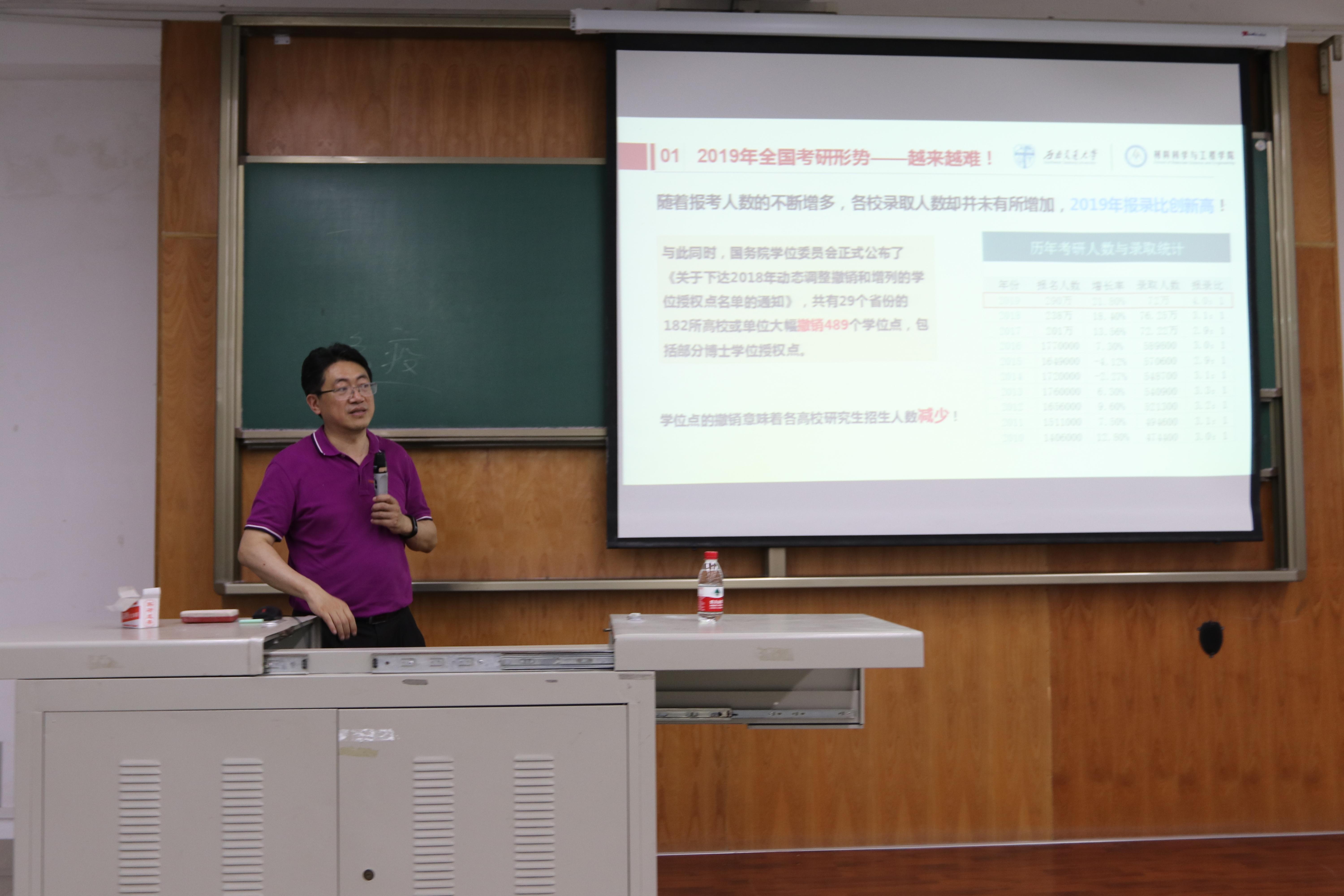 2019年的就业签约情况,鼓励同学们提升实力、早做准备、积极参加招聘会以及端正求职态度。随后,朱旻昊院长针对有意向继续升学的同学,从自己的经历出发,围绕着为什么读研,如何选择学校与老师等内容,提出了诸多有用的建议及告诫,对同学们寄予了深切的期望。最后,朱旻昊教授介绍了自己的研究团队,鼓励优秀的同学报考。