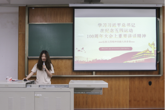 最后,熊芮老师主持主题团课:学习习近平总书记在纪念五四运动100周年大会上重要讲话精神。学习过程,熊芮老师指出伟大的历史事件总能经受时间的考验,伟大的精神力量总能穿越时空的阻隔,五四运动是中华民族百折不挠、自强不息的民族精神的生动写照,是激励一代代有志青年拼搏奋斗的强大精神动力。