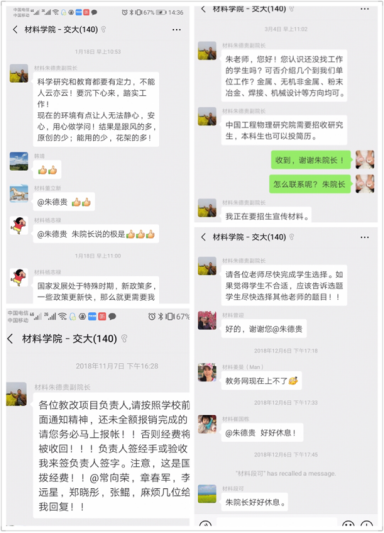 的教工微信群,可以看到朱德贵老师一直关心关注着学院发展、学生成长的各项工作,无论是参与材料学子就业方向的讨论,还是学生SRTP科研项目的申报情况,都能看到他的用心回复。笔者后来从其他渠道了解到,朱德贵老师在那段时间里,每天要吃止痛药,甚至打止痛针,眼睛已经很难看清手机上的文字。微信聊天记录里众多的真知灼见,不知消耗了他多少宝贵的精力!