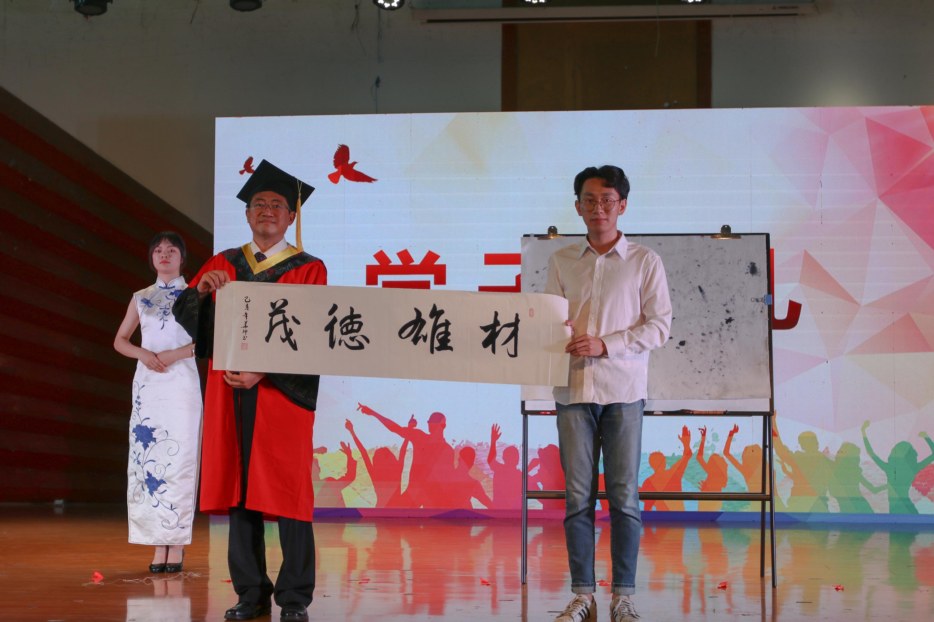 随后,华珅同学在毕业离校感恩学院,献礼学院,现场书写“材雄德茂”赠与学院。笔墨丹青,写不尽材料学子求实创新、知行合一的闪光品质,道不完材料人勇于拼搏,与时俱进的优秀品质。“材雄德茂,爱国荣校”,开学时的迷彩绿似乎还在昨天,而今却已学士服加身,每一位材料人在用自己的四年经历书写着“材雄德茂”的材料精神。