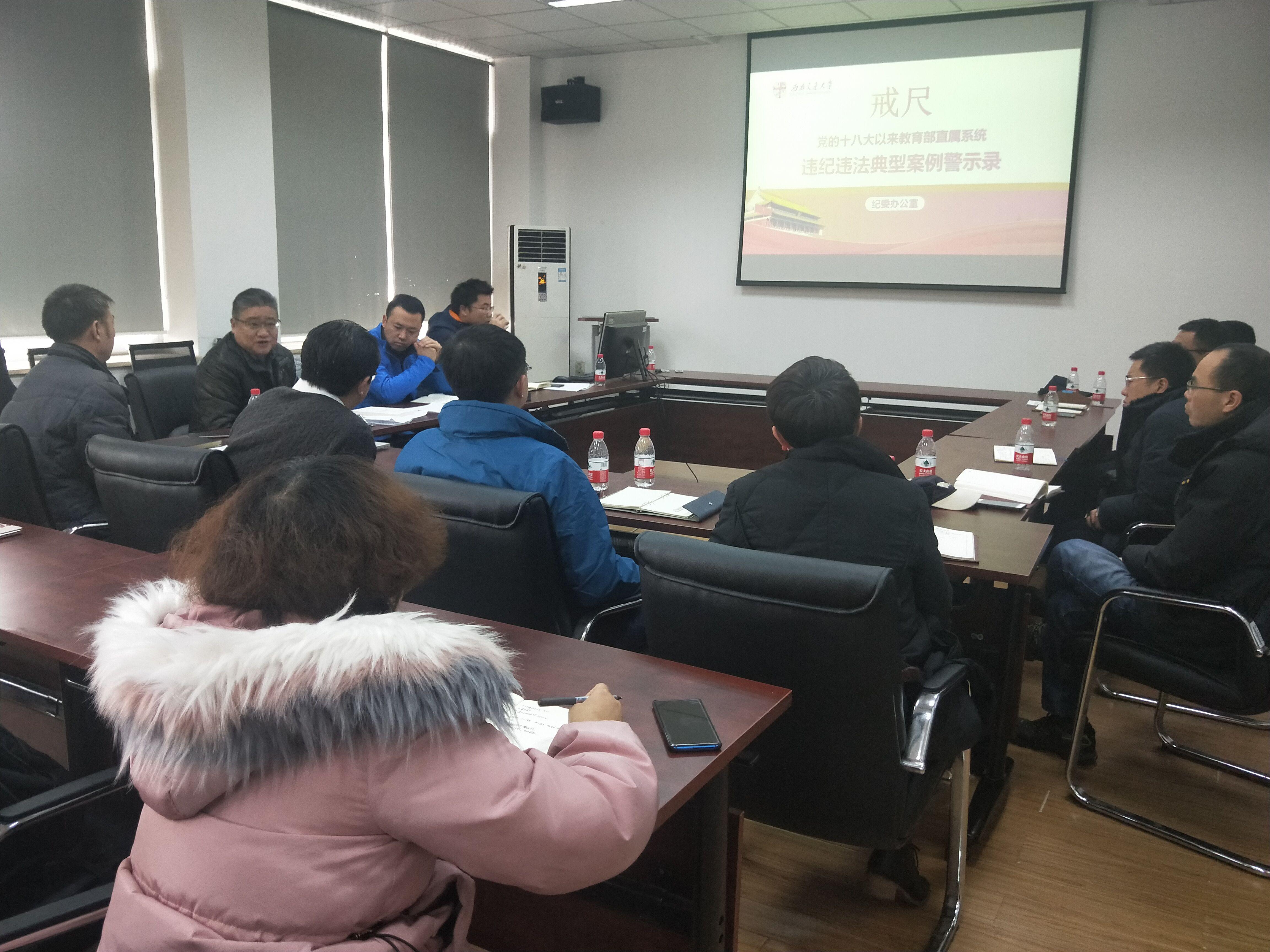 李琦同志主要讲解了《戒尺——党的十八大以来教育部直属系统违纪违法典型案例》和《戒鉴——2018年以来学校身边违纪案例警示集》。李琦同志从通报的典型案例入手,深刻分析了违纪案件涉及不同职级和多种岗位、突破纪律底线以权谋私等特点,通过身边人身边事给大家带来警示,要求与会成员要从反面典型案例中吸取深刻教训,引以为戒,警钟长鸣。并要求党员干部进一步增强廉洁自律意识、提高防腐拒变能力。