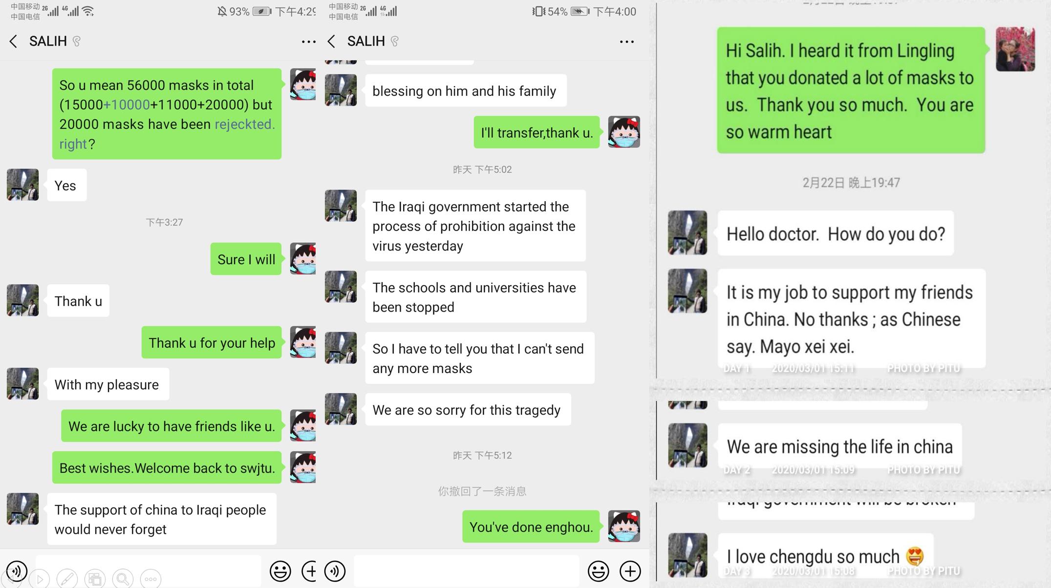 在与萨利交谈中,他多次表达了对中国的热爱和感谢,对交大求学时光的怀念,对疫情的关心,对病人和医护人员的牵挂。“对我来说,需要帮助的人收到了口罩,是最重要的事情,不在乎金钱,不在乎劳累。目前伊拉克政府已开始对病情采取防护措施,所以我不能购买到更多的口罩送往中国,对此感到十分抱歉。”萨利的善良正是“不忘初心”最好的体现,让人十分感动。