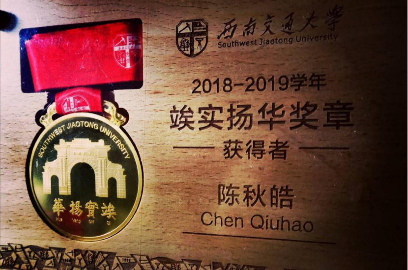 2019年11月,陈秋皓荣获了西南交通大学“竢实扬华奖章”。谈起自己对“竢实扬华”奖章的认识,陈秋皓说到:“从奖章本身的制作工艺来讲,冲压成型表面镀金,一般人或许不会思考什么,但这八个字恰好对应了我本科专业(材料成型及控制工程)和研究生深造方向(离子镀膜)。冲压成型使其有了雏形,表面镀金让其更加精美,这也恰恰是本科到研究生的学习历程。从‘竢实扬华’的含义来讲,众所周知其含义为培养人才,振兴中华,也有许多引申的含义,比如扬弃浮华等等。总而言之,竢实扬华奖章是交大最高个人荣誉,蕴含了交大之精神,更是交大之期望。”
