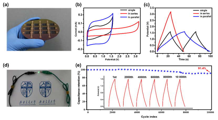 图5. 排列单个高电压芯片式MXene基MSCs。 (a) MSCs三个串联和四个并联在直径为3.5英寸的硅片上;(b) 20 mV s-1扫速下的CV曲线;(c) 20 μA cm-2下两个单个、两个串联和两个并联MSCs的GCD曲线;(d) 两个串联的芯片式MSCs可以点亮一个商用LED灯;(e) 400 μA cm-2下的循环稳定性(插图:不同循环周数下的CV曲线)。
