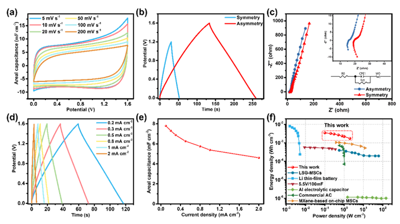 图4. 单个高电压芯片式MXene基MSCs的电化学性能。 (a) 从5 到 200 mV s-1扫速下的CV曲线;(b) 在100 μA cm-2下对称型芯片式MSCs和非对称型芯片式MSCs的GCD曲线对比;(c) Nyquist图和拟合等效电路图;(d) 不同电流密度下的GCD曲线;(e) 计算得出的面电容值;(f) 器件的Ragone图。