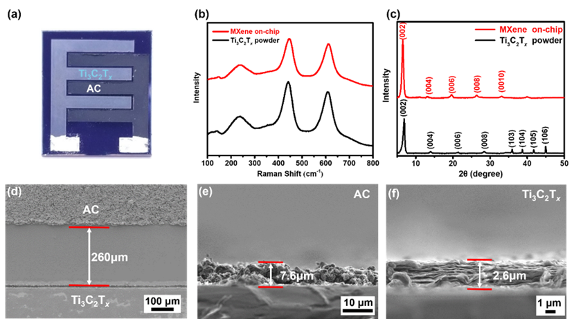 图3. 高电压芯片式MXene基MSCs的微结构与电极材料组分分析。 (a) 高电压芯片式MXene基MSCs的实物图;(b) Ti3C2Tx MXene粉末和喷涂在硅片上的MXene的拉曼光谱;(c) Ti3C2Tx MXene粉末和喷涂在硅片上的MXene的XRD图谱;(d) 芯片式MSCs叉指指间间隙的宽度SEM图;(e-f) 正负电极的形貌和厚度截面SEM图。