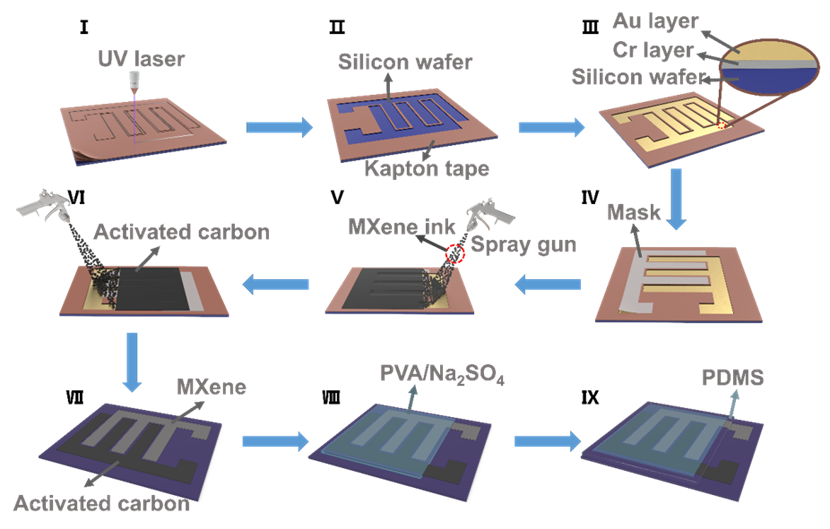图2. 切割-喷涂的制备方法在硅片上制备高电压MXene基芯片式MSCs示意图。
