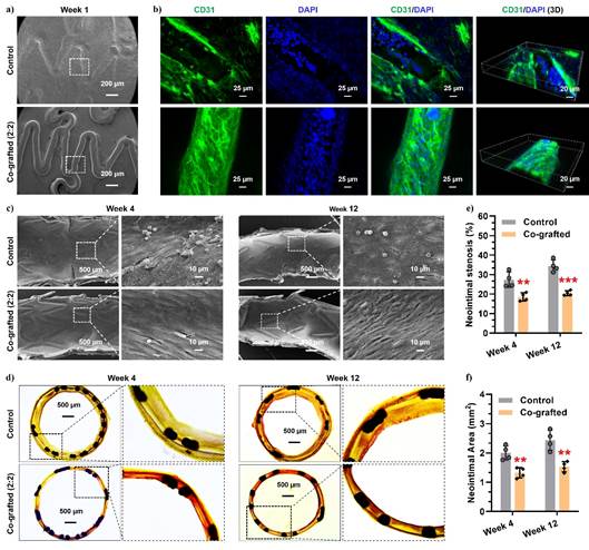 为了证实这种改进的贻贝灵感表面功能化策略在促进内皮再生、抑制血管支架内膜增生和再狭窄方面的优势,作者概念性展示了血管支架表面双功能涂层的构建,即,构建出可特异性识别捕获内皮祖细胞(EPC)和可自催化产生一氧化氮(NO)的双功能涂层(图1)。论文中,作者借助贻贝仿生多肽的表面粘附机制和生物正交点击反应将不同组分的EPC靶向肽和NO催化剂高效地接枝在血管支架表面上,并通过简单地调节投料比例优化双功能涂层的组分,得到了具有最显著抗凝血、抑制平滑肌细胞增殖迁移、促进内皮祖细胞贴附和定向分化为内皮细胞的支架表面。体内研究进一步显示,通过可生物点击的贻贝仿生多肽优化之后的双功能血管支架可有效快速地促进血管支架表面的内皮化(第1周)。在长期植入情况下(第4-12周),表面接枝有优化双功能组分的血管支架可以显著地抑制内膜增生和支架的再狭窄(图2)。这项研究最直接的意义是为心血管植入器械表面多功能仿生设计提供了理论支撑和指导;从应用的价值来看,该项工作将生物正交化学的特异性分子修饰和贻贝分子粘附的普适性有效结合,通过快速促进内膜再生修复,有望显著降低/解决临床血管支架在应用中面临的支架内再狭窄我晚期血栓等并发症的发生。
