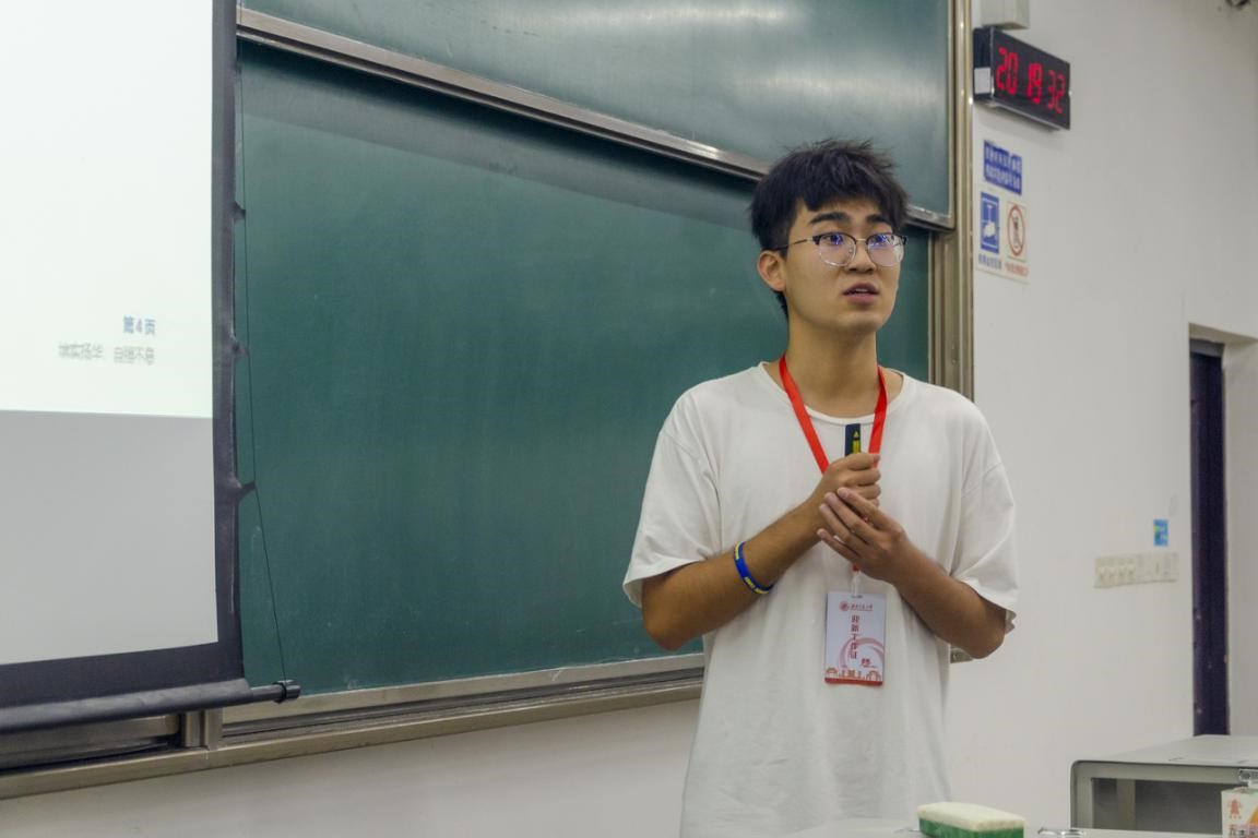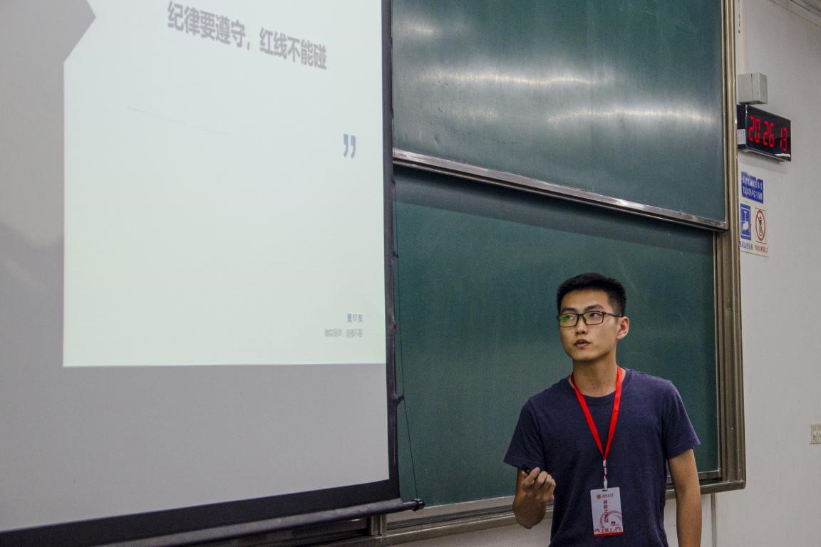 然后,年级助理陈宏宇学长向同学们讲解了与日常学习生活息息相关的纪律管理规定,涉及纪律处分、诚信考试教育、寝室违章电器等。宏宇学长通过列举案例提醒同学们守住底线,守住安全。
