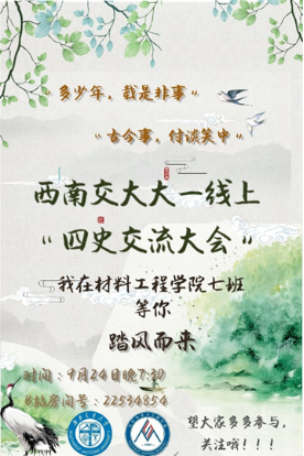 结合新生入学教育相关要求,促进新生适应大学生活、引导新生成长发展,全面提高综合素质,以班级团支部为单位自行组织学习“四史”相关知识后,开展“四史”故事我来讲主题演讲比赛(主题团日活动),各班级团支部全员参与、全程网络直播,脱稿演讲(可使用PPT辅助,每页不超过20个字),每人限时3-4分钟。每个班级推选3名表现优异的同学参加第三阶段的全年级评比活动。
