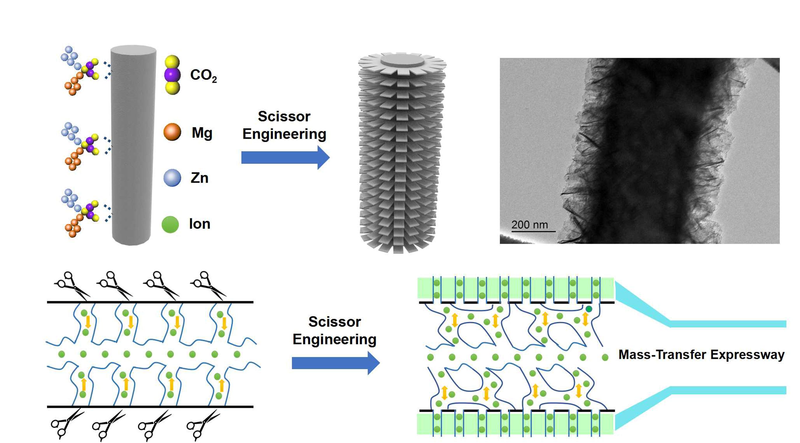 2018级硕士生王庆通过分子剪刀剪切策略实现不同维度碳纳米材料的可控化构建,并对它的裁剪机理进行了详细的阐述。不同于目前广泛研究的表面修饰技术,他们采用分子剪刀打开碳材料的表面,实现分子尺度上的裁剪。在一定的温度条件下,锌蒸气和镁蒸气会进入碳材料的内部,一旦遇到二氧化碳就会形成一把分子剪刀,进而实现碳纳米材料的可控裁剪。测试表明,分子剪刀作用下的碳纳米材料不仅拥有高的比表面积,而且拥有适宜的孔径分布。在PVA/Na2SO4凝胶电解质体系中,器件展现出4.63 mWh cm–3的能量密度(对应功率密度为3520 mW cm–3)。研究者相信,此项研究提出的分子剪刀剪切策略一方面将会为碳纳米材料的革新提供借鉴意义,另一方面将会促进能量存储、传感和环境修复等领域的发展。该研究成果以“Tailoring Carbon Nanomaterials via a Molecular Scissor” 为题发表在《Nano Today》上。