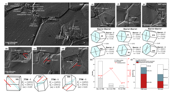 裂纹形貌以沿晶裂纹为主,其次为穿晶裂纹,其中驻留滑移带和孪生是两类重要的穿晶裂纹源,研究还观察到晶界滑移转移/孪生转移有关的穿晶裂纹。根据裂纹统计和位错滑移迹线分析,尽管基面滑移在所有激活的滑移系中占比最多,但二级角锥面<c + a>滑移引起的驻留滑移带的开裂率达到最高。结合较小的归一化施密特因子和几何必需位错密度的不均匀性,研究认为局部应力集中是二级角锥面<c + a>滑移具有最高开裂率的可能原因。